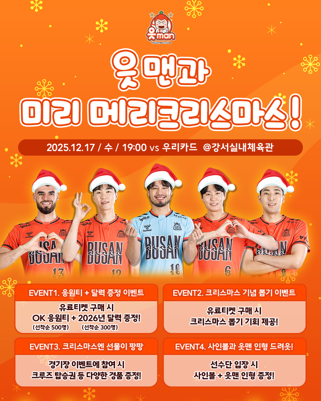 OKÀúÃàÀºÇà À¿¸Ç ÇÁ·Î¹è±¸´Ü(±¸´ÜÁÖ ÃÖÀ±, ÀÌÇÏ OK À¿¸Ç ¹è±¸´Ü)Àº 12¿ù 17ÀÏ ºÎ»ê °¼½Ç³»Ã¼À°°ü¿¡¼ ¿¸®´Â Áø¿¡¾î 2025-2026 V-¸®±× 3¶ó¿îµå ¿ì¸®Ä«µå¿Í Ȩ°æ±â¿¡¼ Å©¸®½º¸¶½º ºÐÀ§±â¸¦ ´ãÀº ´Ù¾çÇÑ ÆÒ Âü¿© À̺¥Æ®¸¦ ÁøÇàÇÑ´Ù°í ¹àÇû´Ù.
